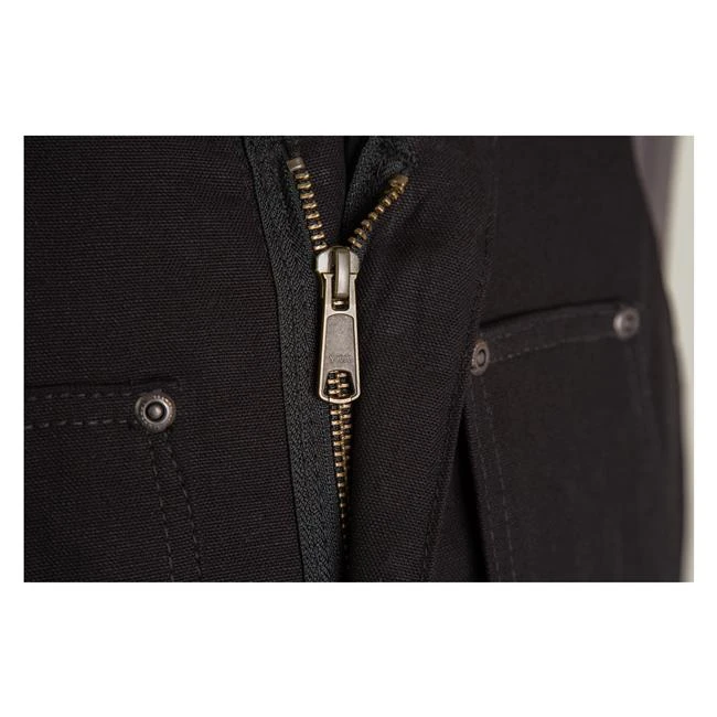 - Heavy-duty brass two-way front zipper and brass leg zipper with snap closure at hand opening for lasting wear